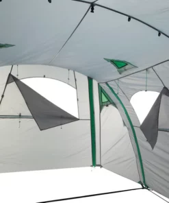 In der Apsis ist Platz für Ausrüstung oder einen kleinen Tisch mit Stühlen. Bei schönem Wetter lassen sich alle drei Eingänge aufrollen oder mit den im Lieferumfang enthaltenen Aufstellstangen aufstellen. Das Aufstellen sorgt nicht nur für besseres Klima und schönen Ausblick, sondern dient gleichzeitig als Sonnenschutz. Jede Tür verfügt über ein eigenes Fenster, das mit Stoff verschlossen werden kann.