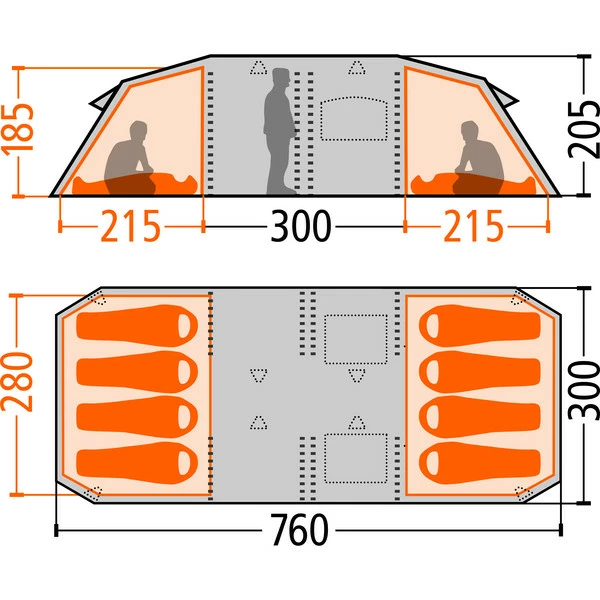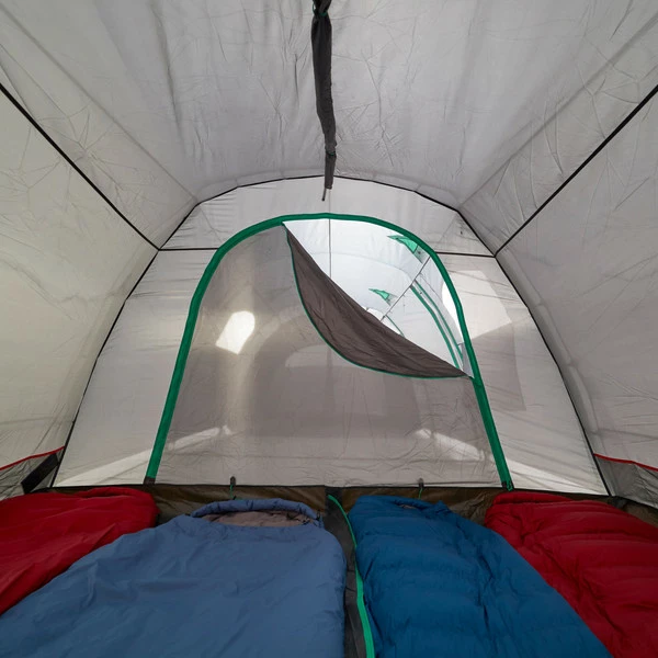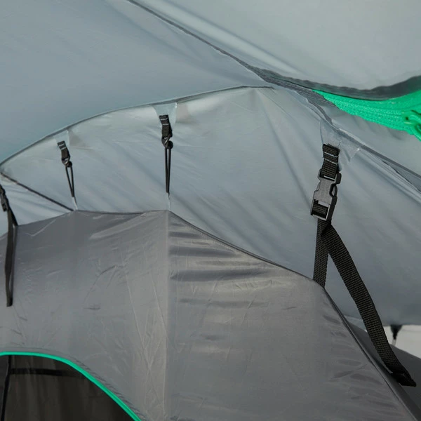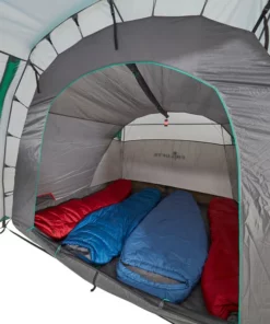 Werden beide Innenzelte ausgehängt, kann das verbleibende Überzelt als Zelt für z.B. Gartenpartys dienen. Vier Eingänge, die teilweise auch hochgestellt werden können, bieten nicht nur eine gute Aussicht, sondern mit den acht weiteren Lüftern auch eine optimale Raumbelüftung. Die Fenster stellen jedoch auch bei geschlossenen Eingängen eine gute Sicht nach draußen bereit.